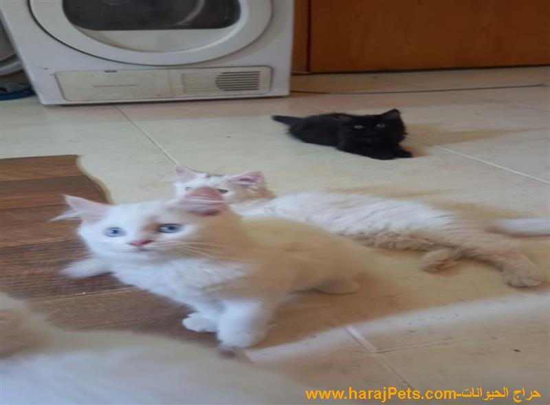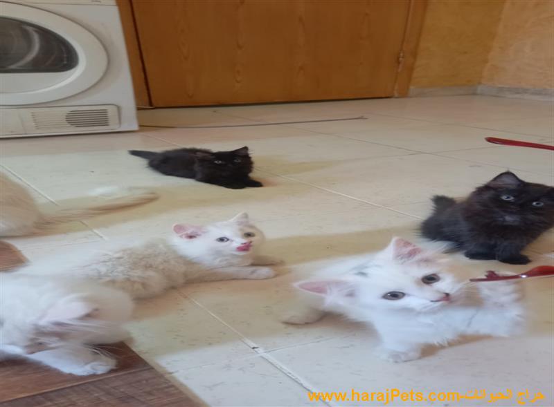 عدد القطط 5 ثلاثة لونها ابيض واثنين لونها اسود مع برونزي
