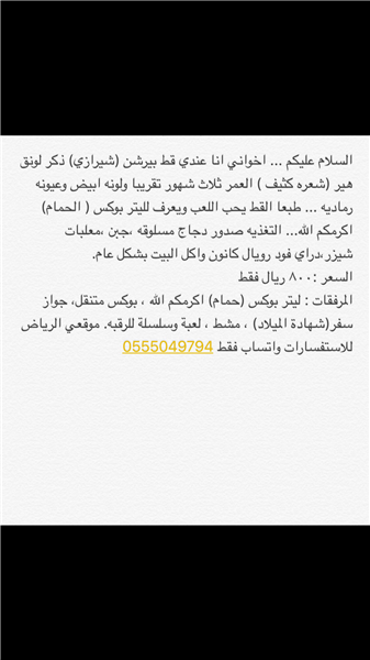 القط شيرازي امريكي ومعاه اغراضه وجواز ومطعم اللون ابيض وعيون رماديه السعر ٨٠٠ ريال للتواصل واتساب فقط